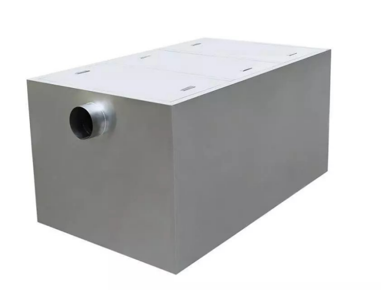 油水分离器采用不锈钢材质,工作原理:当含油污水流入时,除渣篮将5mm以上的固体杂物(菜叶、饭渣等)彻底截流,固体残渣留在除渣篮内;过滤后的污水进入第二级后,利用水流的动能,使油珠连续碰撞后由小变大,由此加速运动,使不同比重的油、水实现分流和分层,达到油水分离的效果,过滤后较大的沉淀物会被阻流板隔离在油水分离区前部,剩余的微小悬浮物通过虹吸装置进入过滤区;油水分离后的污水进入第三级(过滤区)后,从深化过滤器下端的入口自下而上,分别经每层滤片的进水孔翻越拦截堤坝进入围堰沉淀区,滤芯材质选用特殊的亲油复合材料,并经独特结构设计后增大表面积和延长围堰拦截堤坝长度,使得污水经过滤芯时的流速相当缓慢,经过与滤芯充分接触后,污水含有的极细小的油珠和细小悬浮物被吸附,进一步降低污水中的油脂含量和悬浮物指标;处理后的达标废水经虹吸装置自流排出。
