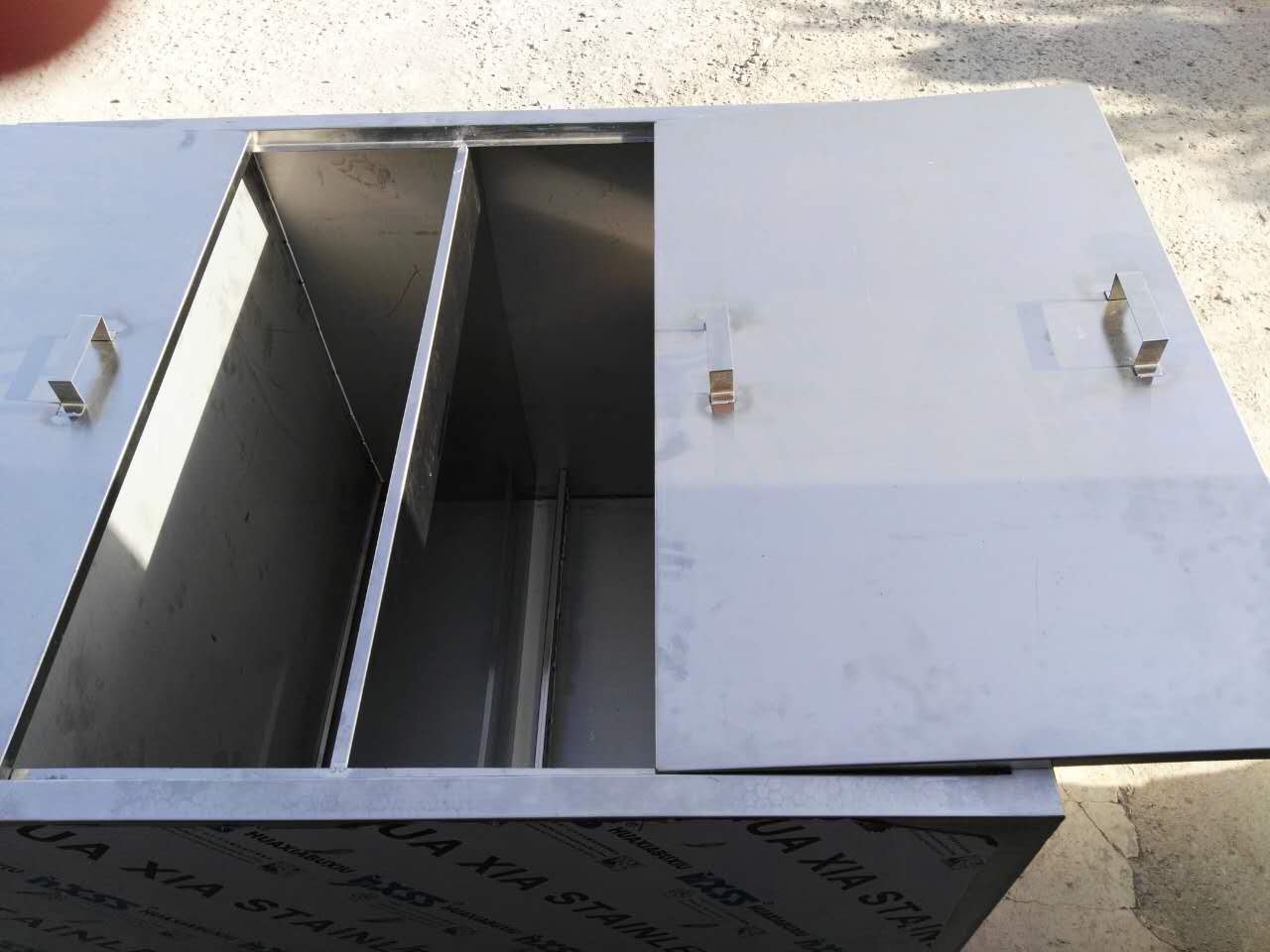 油水分离器采用不锈钢材质,工作原理:当含油污水流入时,除渣篮将5mm以上的固体杂物(菜叶、饭渣等)彻底截流,固体残渣留在除渣篮内;过滤后的污水进入第二级后,利用水流的动能,使油珠连续碰撞后由小变大,由此加速运动,使不同比重的油、水实现分流和分层,达到油水分离的效果,过滤后较大的沉淀物会被阻流板隔离在油水分离区前部,剩余的微小悬浮物通过虹吸装置进入过滤区;油水分离后的污水进入第三级(过滤区)后,从深化过滤器下端的入口自下而上,分别经每层滤片的进水孔翻越拦截堤坝进入围堰沉淀区,滤芯材质选用特殊的亲油复合材料,并经独特结构设计后增大表面积和延长围堰拦截堤坝长度,使得污水经过滤芯时的流速相当缓慢,经过与滤芯充分接触后,污水含有的极细小的油珠和细小悬浮物被吸附,进一步降低污水中的油脂含量和悬浮物指标;处理后的达标废水经虹吸装置自流排出。
